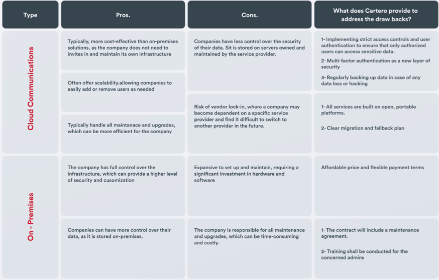 On-premises communication solutions are managed and maintained by the company itself, while cloud communication solutions are managed and maintained by the service provider.